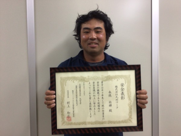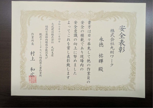 ㈱九州ワークの永徳裕輝社員が大成建設㈱の福岡空港国内線複合施設の現場にて